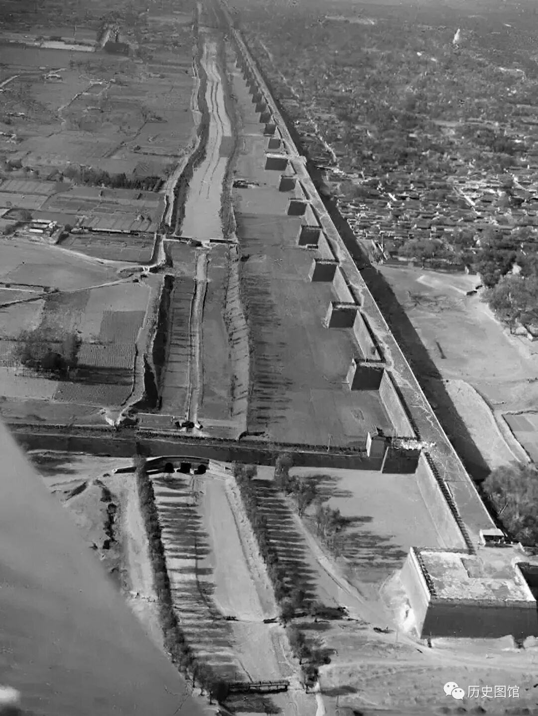 这是位于北京西面的一段城墙,巨大的城墙一眼望不到尽头。城内有密集的民居房屋,城外是肥沃的田野。