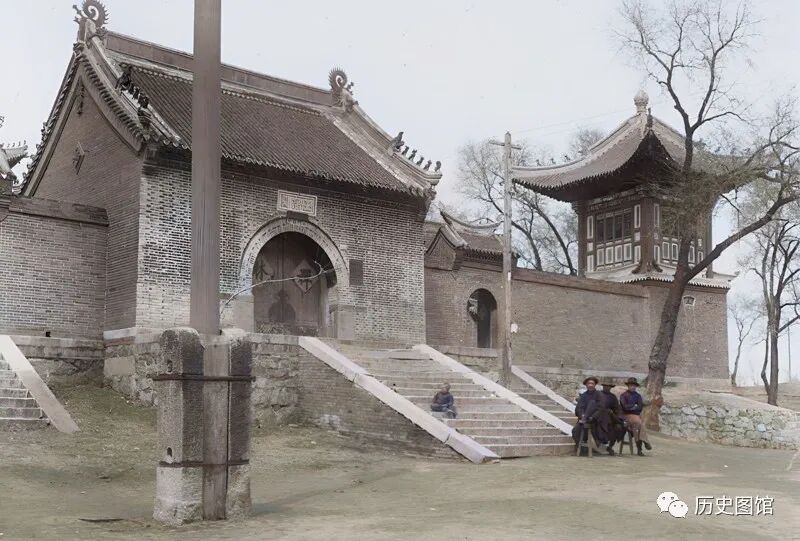 玉皇阁,在1936年进行了重修,规模宏大。由山门、钟楼、鼓楼、祖师庙、观音殿、老郎殿及胡仙堂组成。几名游客正坐在台阶前的凳子上休息。
