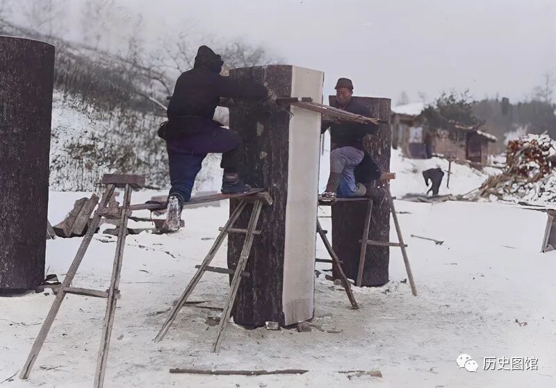 蛟河附近,两名男子正站在架子上,用大锯锯开一整块木头,分成小块售卖。山上原始森林里的树木长得都很粗壮。拉大锯既是力气活,也要讲究技巧。照片中两人配合得很默契。