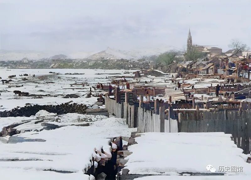 这是一座码头,位于松花江边,看上去规模不小。码头上堆满了各种各样的木材,等待运往全国各地。远处的江岸上,建有有很多民居面朝江面,最远处还能看到一座高高的欧式塔楼。