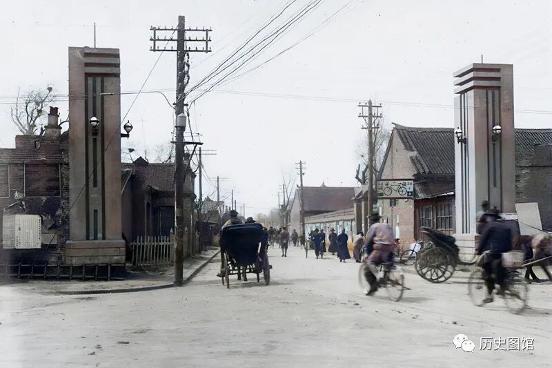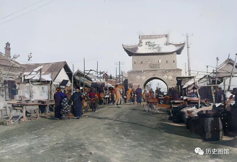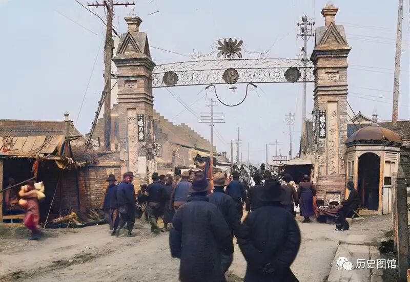 1936年的吉林磐石县县城,高大的城门巍峨壮观。城门前有一条繁华的街道,街道两旁的店铺一个挨着一个。街道上很多人在逛街。