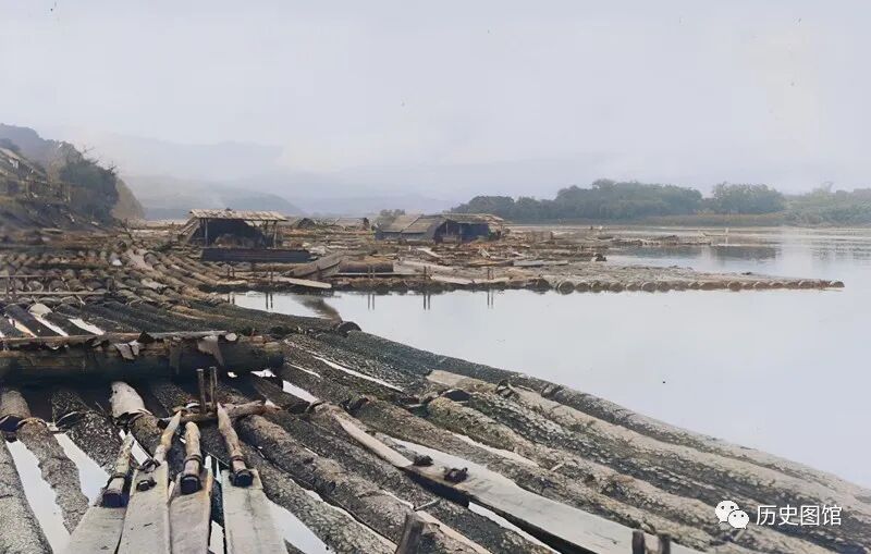 松花江上游的阿什哈达,江面上漂浮着从山上砍伐下来的木材组成的木筏,顺流而下很是壮观。这张照片拍摄于1932年。