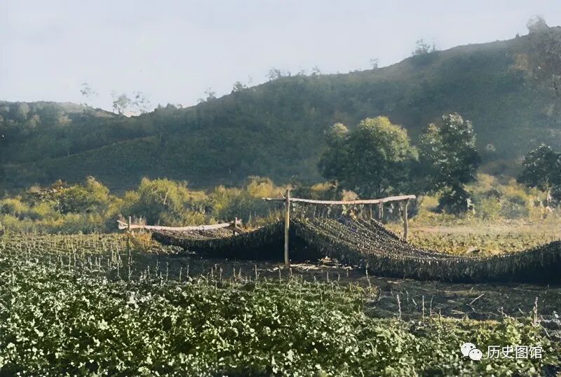 这片地里种植的作物是烟叶,位于吉敦线六道河附近。田地旁边,搭建有晾晒烟叶的木架。架子上挂满了采摘下来的烟叶。照片拍摄于1932年。