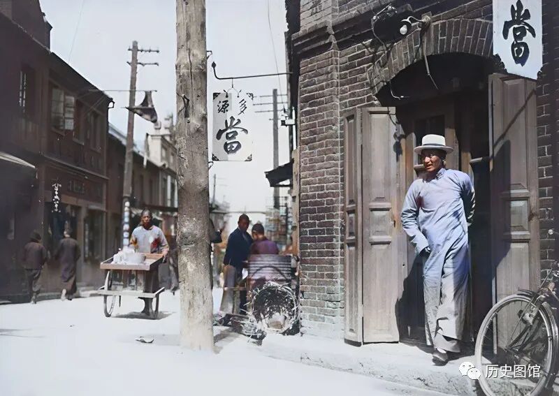 街边拐角处,有一间当铺。门口悬挂着写有“当”子的旗帜。一名男子正从当铺里走出来。在过去,街上的当铺很多。一些手头紧的人,可以拿自己的物品到当铺换钱。当铺的旁边,有一个小吃摊,一名推着两轮车的人从街上走过。