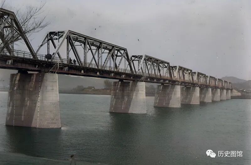 这座钢架桥叫“吉敦铁路大桥”,横跨松花江上,靠近团山。这座铁路桥是日本人修建的,修建于1927年。日军撤出吉林时,曾炸毁1、5、9号桥墩。1948年修复通车。此照片拍摄于1934年。