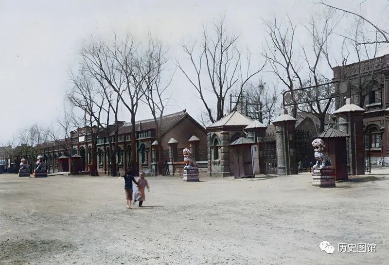 照片中个大院,就是当时的伪吉林省公署。门前立有两只石狮子。前面还有一个院子,门前也立有两个石狮子,左边是驻吉林东三省保安副司令部。公署门前是一条十分宽敞的大路,两个孩子正从大路上走过。照片拍摄于1934年。