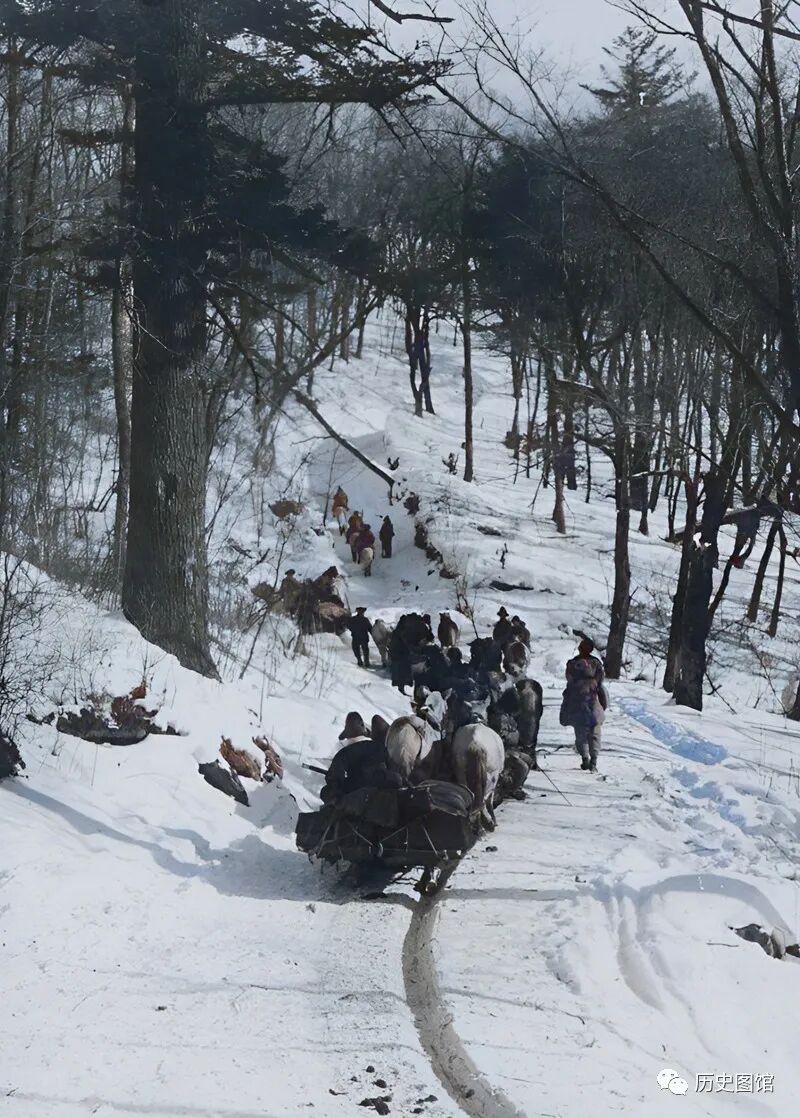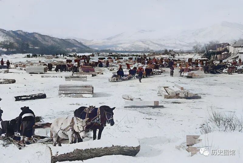 这是位于蛟河双岔河的一个露天木材市场,规模不小。当时是冬季,很多待售的木材码放整齐,摆在雪地上。交易后的木材被马匹拉走。吉林市有丰富的林业资源,像这样的木材交易市场当时有很多。