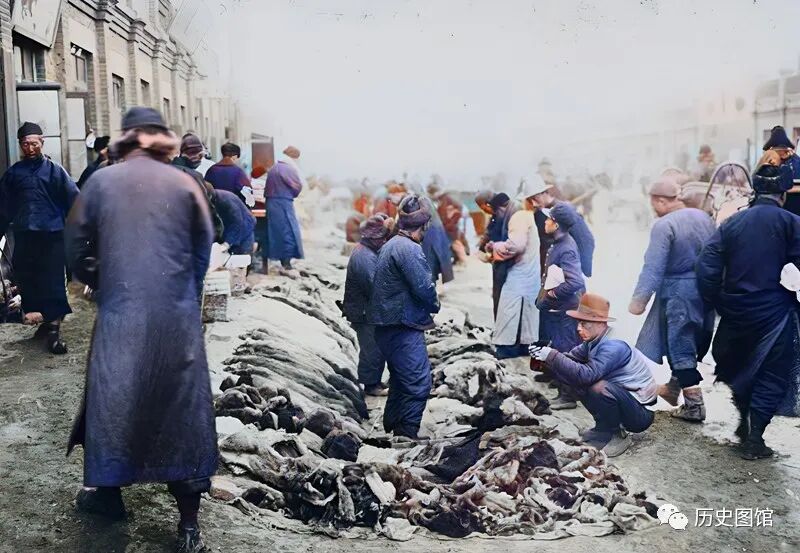 在这条街道边上有个露天市场,有两名男子正在摆地摊。他们面前的地上堆满了各式各样的动物皮子和棉衣。一些路人在仔细挑选商品。