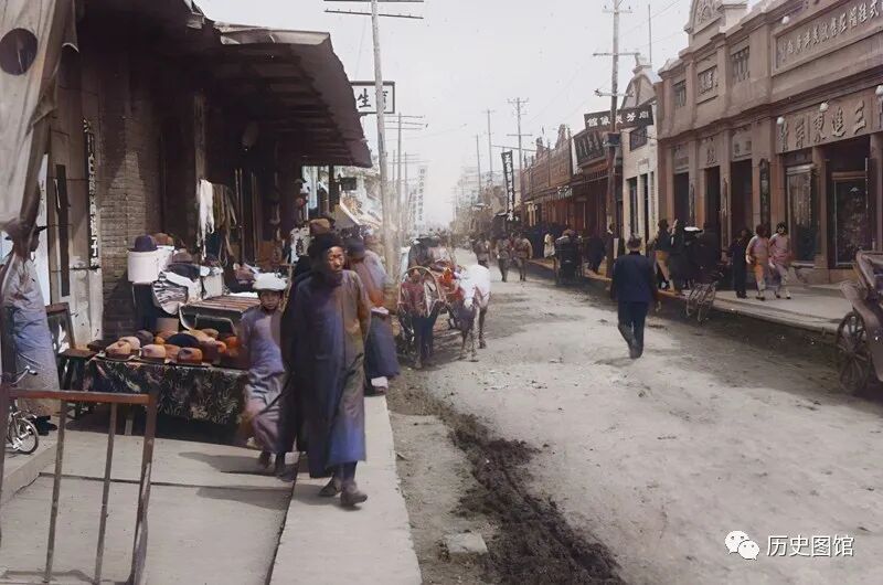 这是当时额穆县县城里的一条街道,街道两旁的店铺正在营业,一些店家把商品摆到了路边。街道上行人如织。额穆县,设立于1909年,县治位于蛟河。