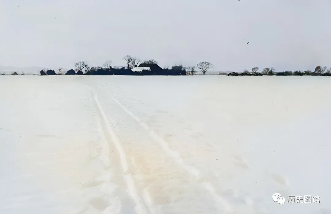 1936年,雪后的辉发城风光。放眼望去,四野被大雪覆盖,地面上有两道车辙,延伸向远方。远处的房屋就是辉发城所在地。