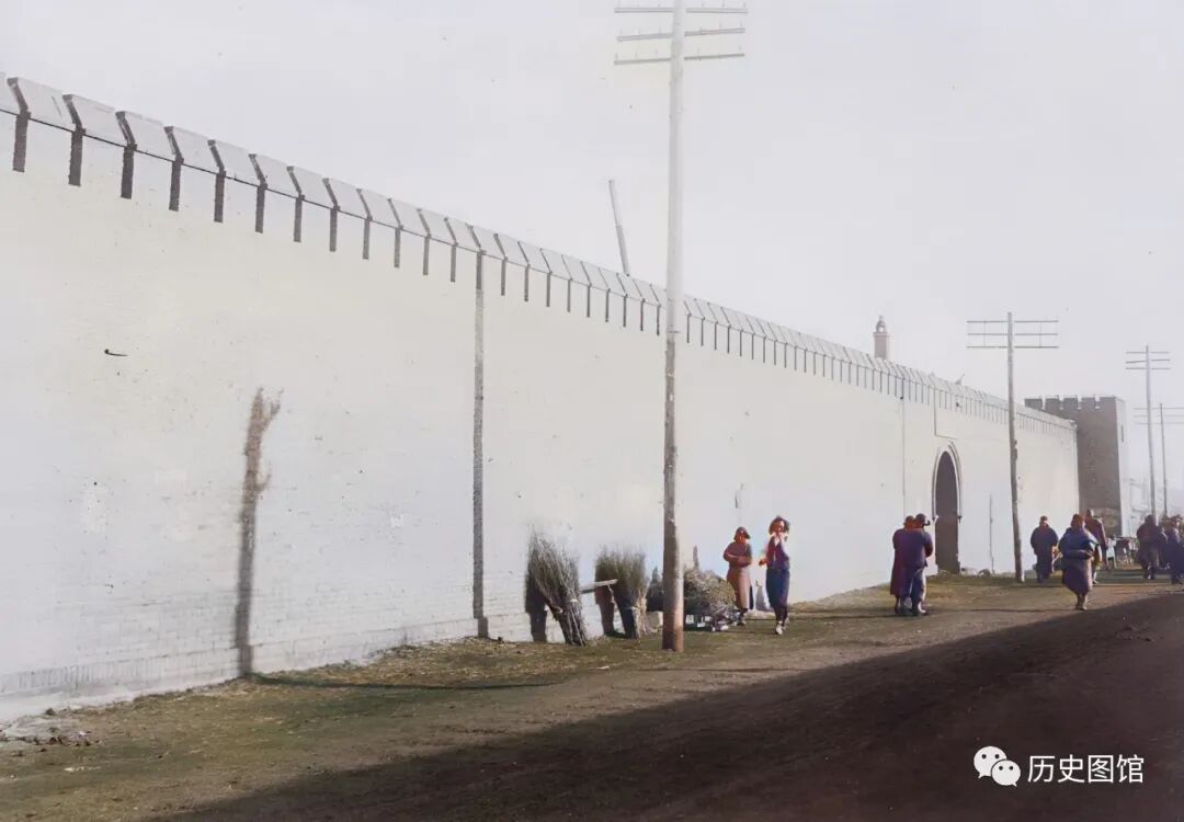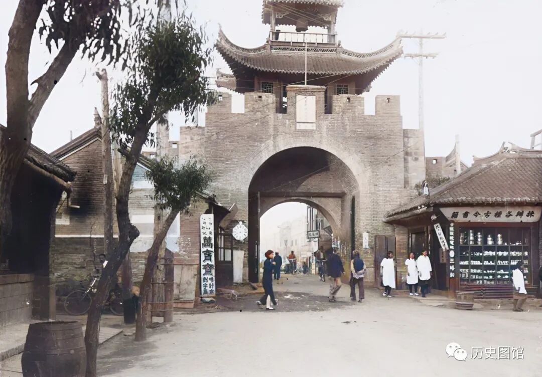 城门两侧是一些商铺,门口的招牌清晰可见,还有人骑着自行车从城门下通过。这座城门修建于19世纪末,已有上百年的历史。可惜的是,城楼在建国后被拆除。