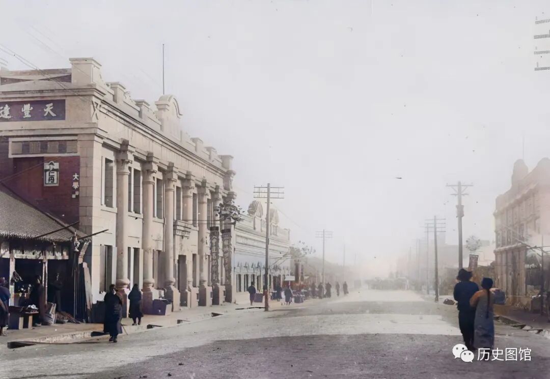 1936年冬天,海龙县城街景。街道宽阔,一眼望不到尽头。两侧的建筑大部分是欧式风格。街边还有一些小贩在摆摊。天气晴好,一些行人正从街上走过。