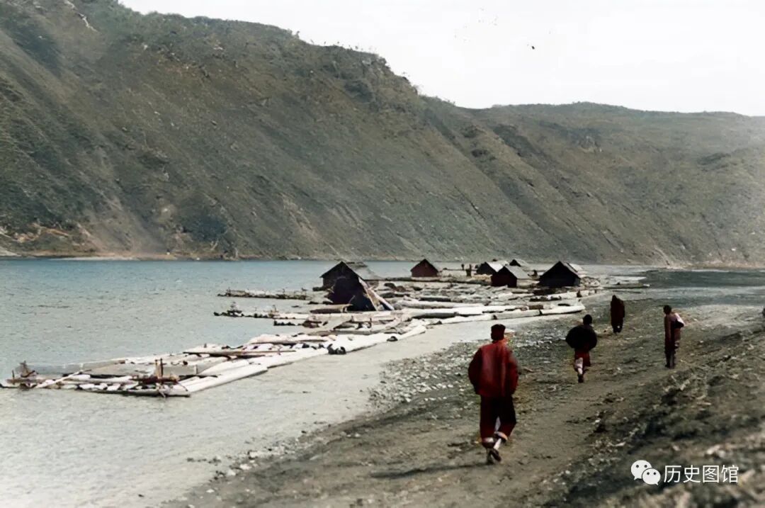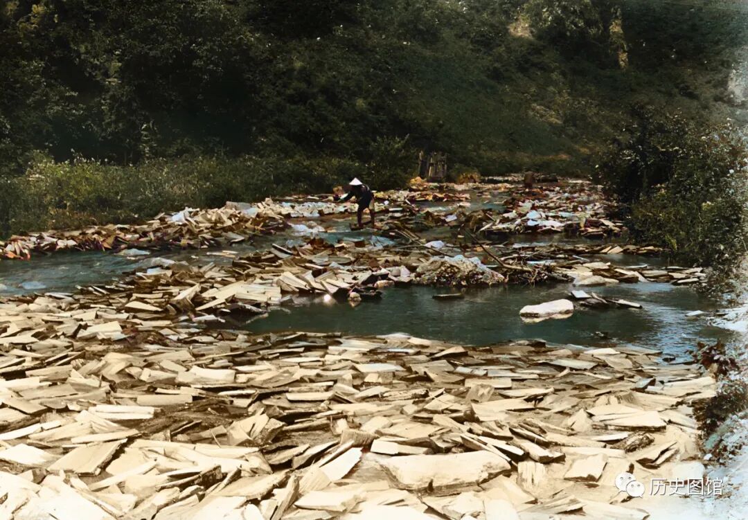 两名男子正在水中操纵这些木片漂往下游,这与鸭绿江上的放排有点类似。照片拍摄于1939年。