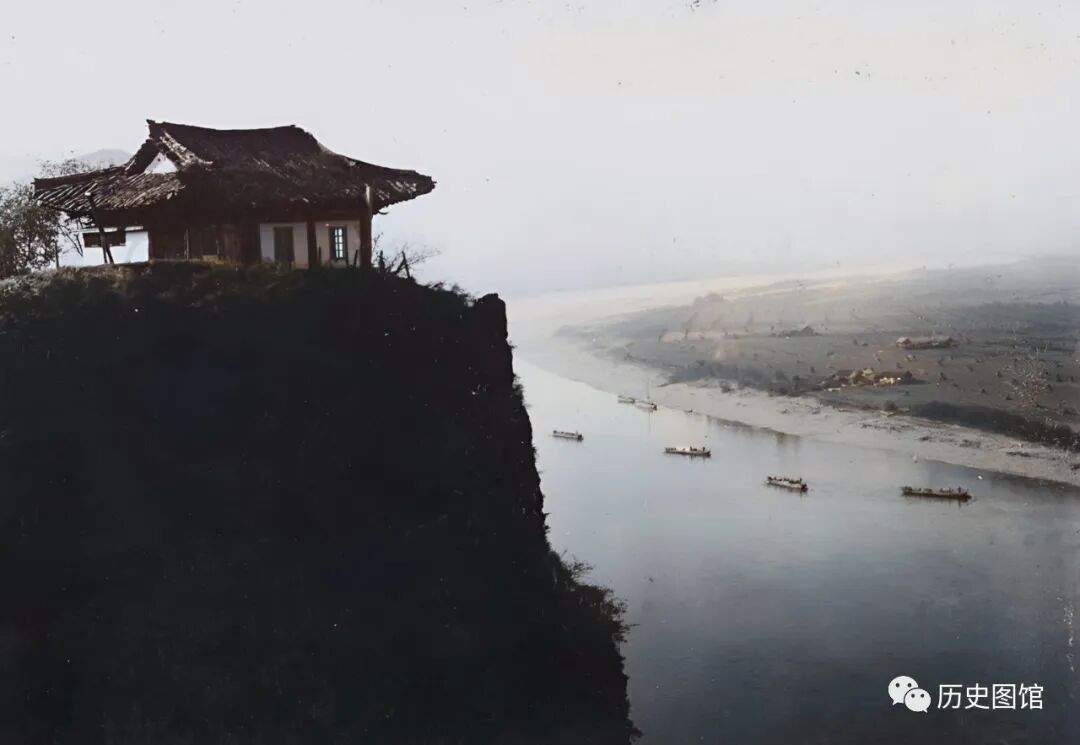 1939年,站在山上远眺鸭绿江。宽阔的鸭绿江上,大小船只来往穿梭。鸭绿江流经朝鲜的满浦段。那里有肥沃的土地和一些小村落。