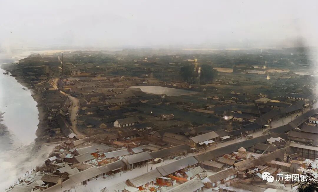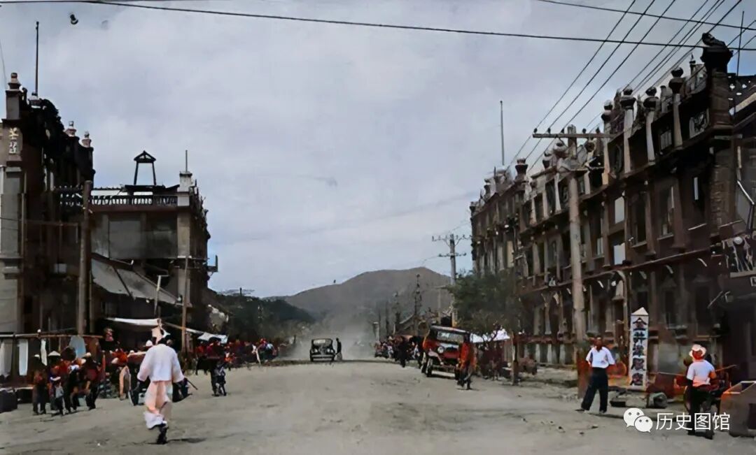 站在高处,俯瞰通化城,场面恢弘大气。近处,是一条繁华的街道,街道两侧是古色古香的民居。远处,房屋鳞次栉比,一眼望不到边。照片拍摄于1939年。