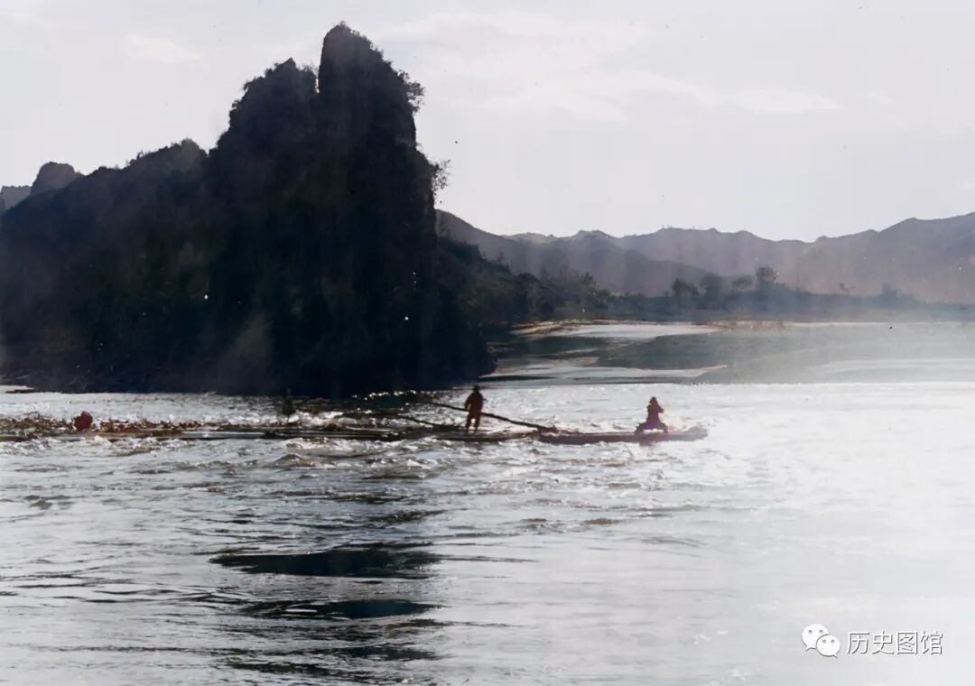 两名放排人,正操作着木排从关门砬子中间的水道通过。江水湍急,需要高超的技术才能顺利通过此处。照片拍摄于1939年。