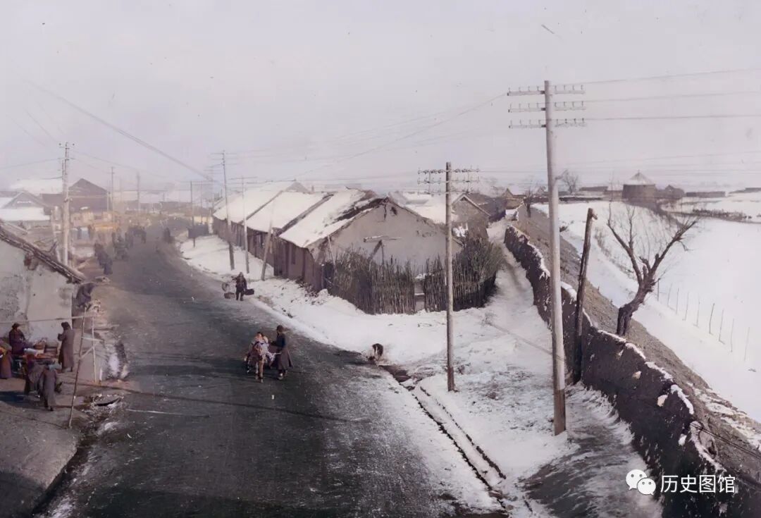 这张照片拍摄于朝阳镇。1936年的冬天,天气十分寒冷,房屋、路面及河道里的积雪还没有完全融化,白茫茫一片。有人赶着马车从街上走过。路边,还有卖早点的小摊贩。