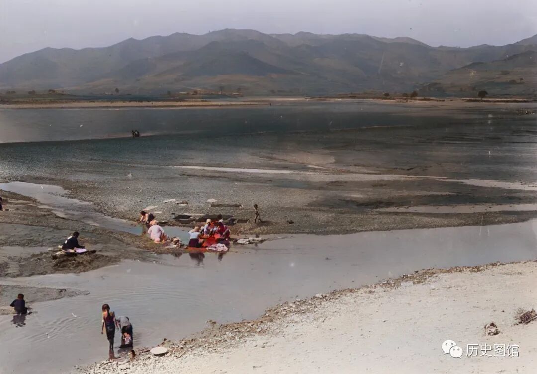 1939年的浑江风光。河水清澈见底。在河中间的沙地上,有一群妇女在洗衣服,还有孩子在水中嬉戏,充满了生活气息。