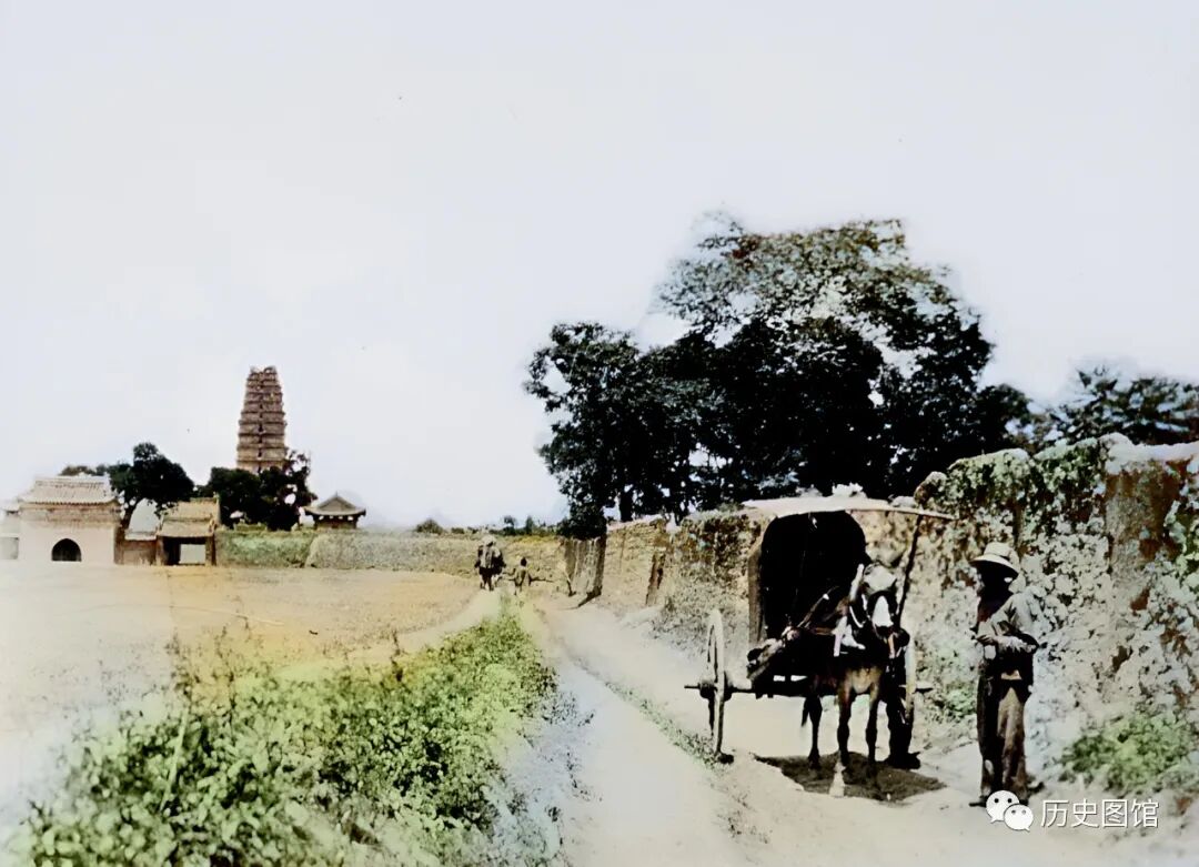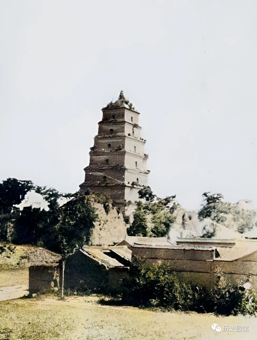 这是30年代的大雁塔,从底部向上阶梯状收缩,整座塔高耸入云,看上去非常古朴。大雁塔,位于慈恩寺的后院。当时,寺庙前有大片的农田和村庄分布。