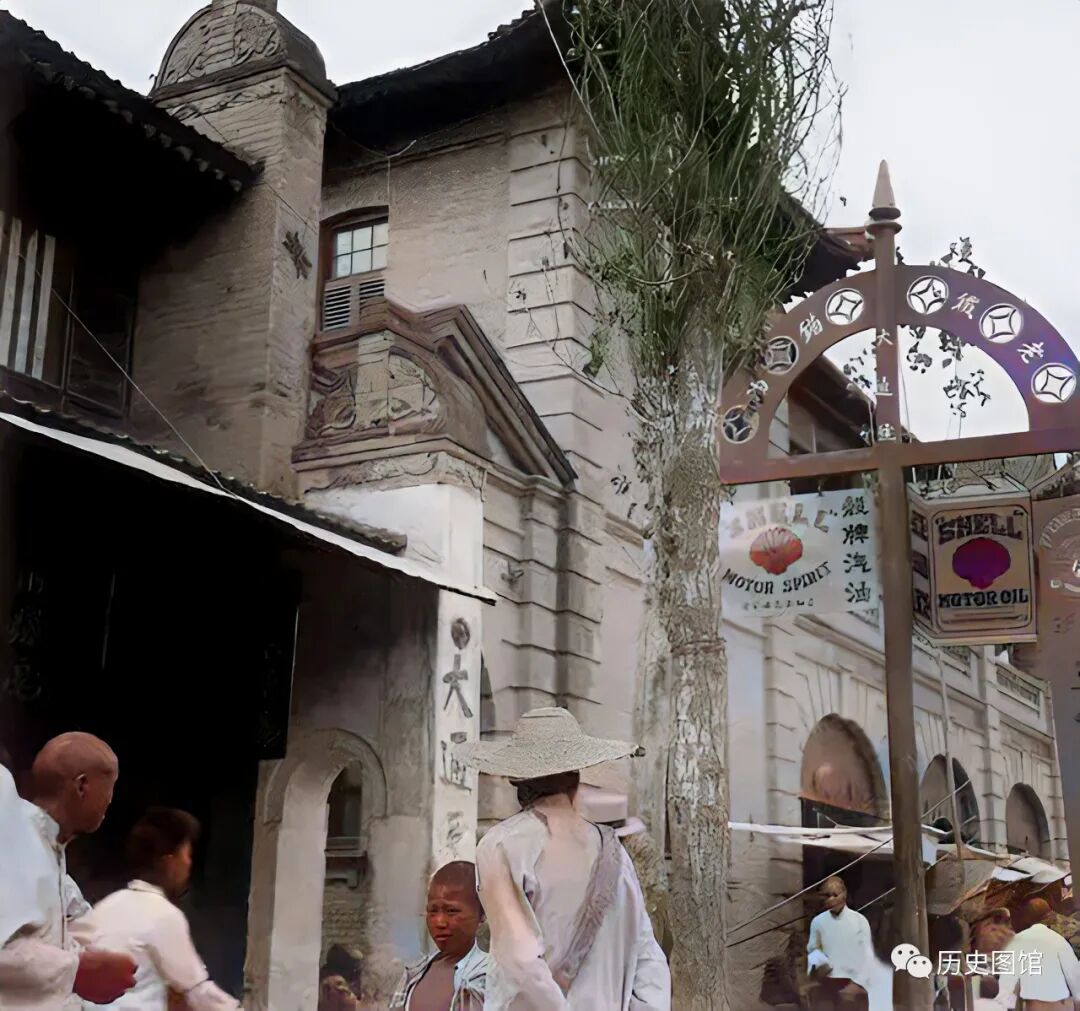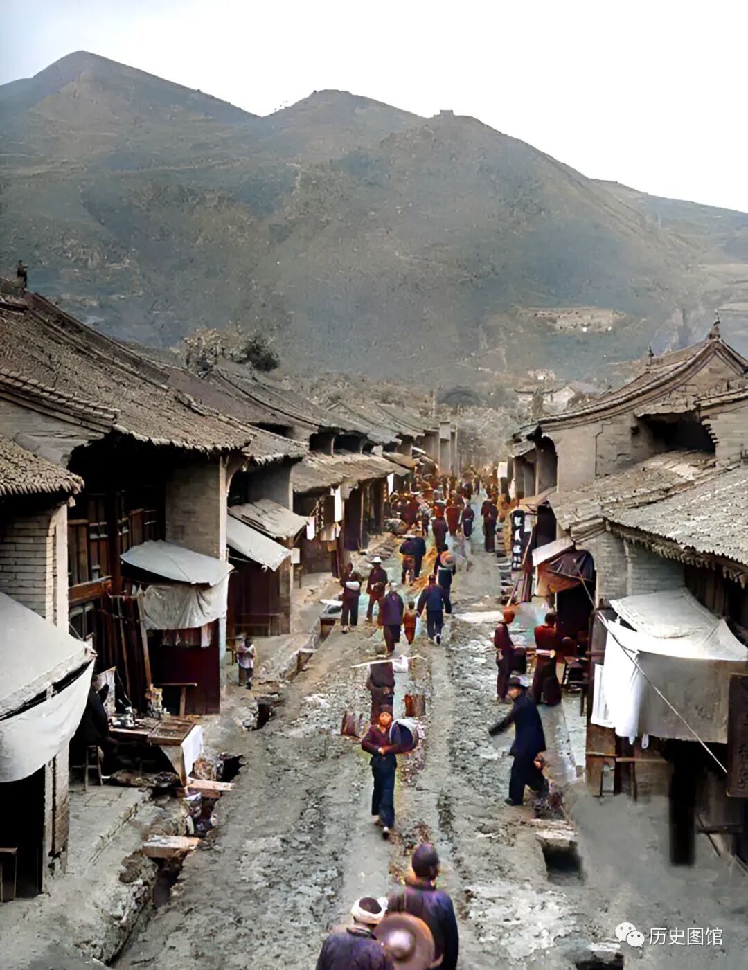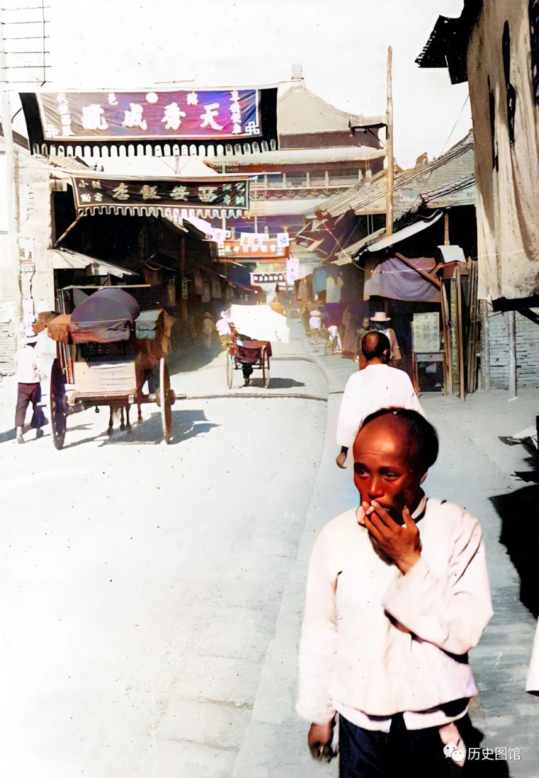 这是30年代末,西安临潼城内一条热闹繁华的小街,街道上人来人往。街道两侧的建筑古色古香,一楼商铺都在开门营业,每家店铺门口都撑起了遮阳棚,可见当时此处的商业氛围很浓。