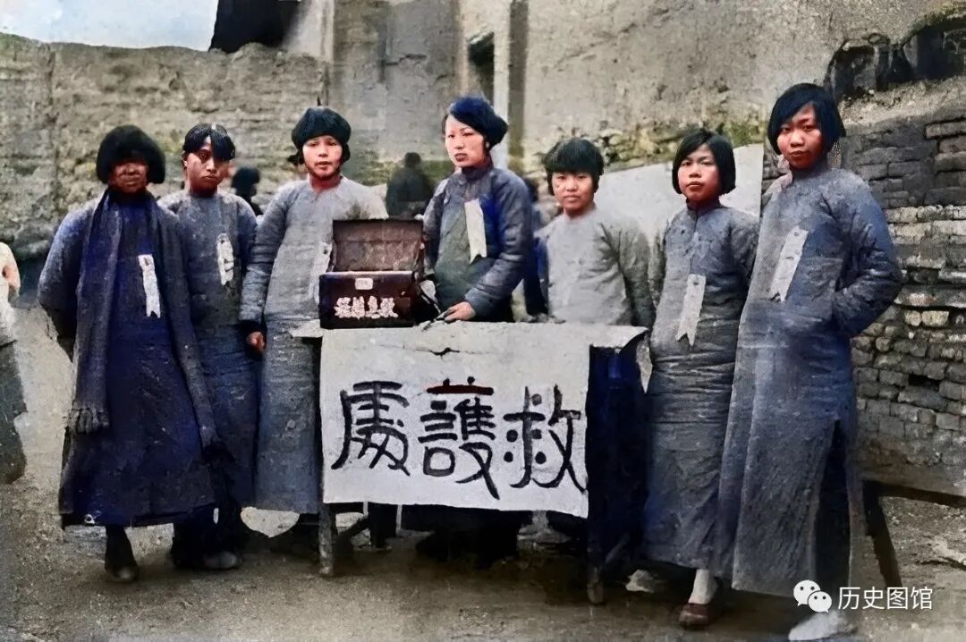 照片中这几名女子,就是当地救护队的成员。她们在救护站门口摆放一张桌子,桌布上写着“救护处”三个大字。只要有需要帮助的人,都可以到这里接受救助。虽然都是平凡女子,但她们都称得上是巾帼英雄!
