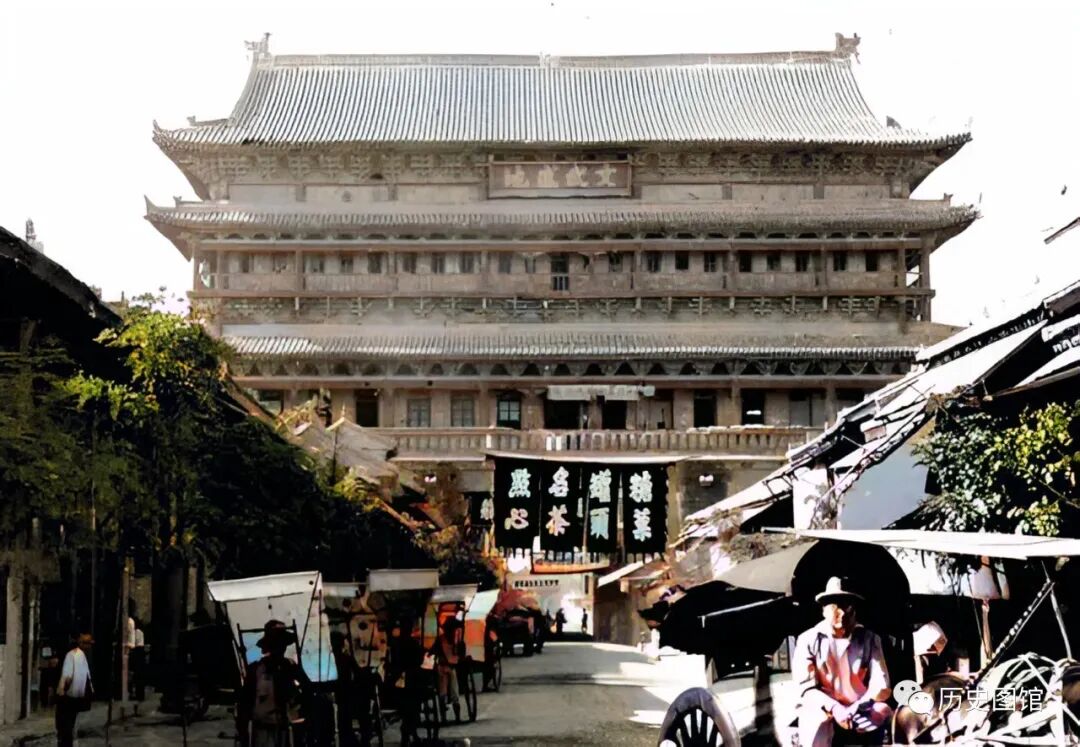 西安鼓楼,始建于明洪武十三年(1380年)。照片中,鼓楼前是一条繁华的商业街,两旁有很多店铺,门前停着一些等待载客的黄包车。