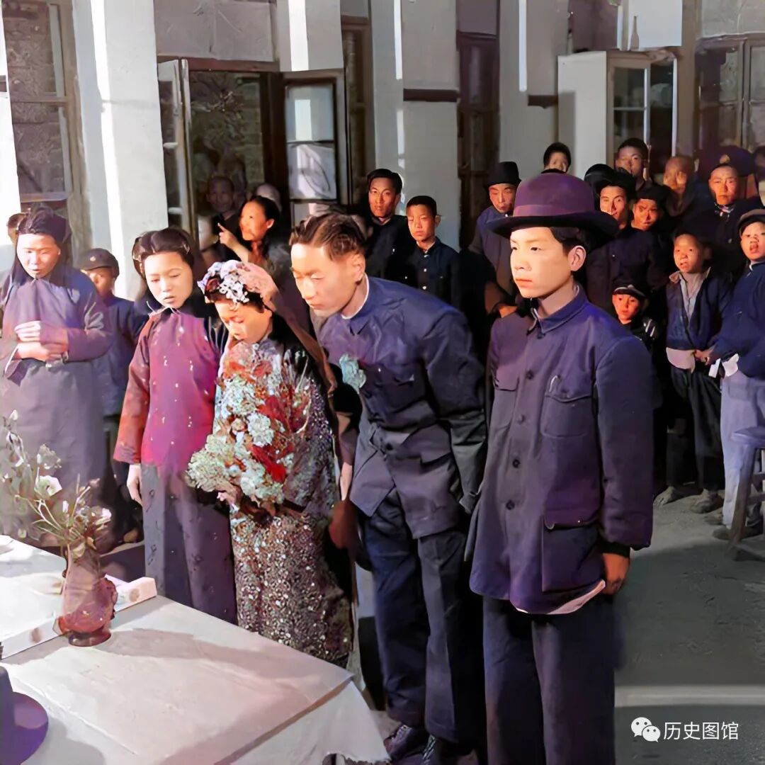 30年代,西安临潼一对新人正在举行隆重的结婚仪式。新郎年轻帅气,一身笔挺的中山装;新郎貌美如花,身着碎花长裙。伴郎和伴娘分别站在左右。