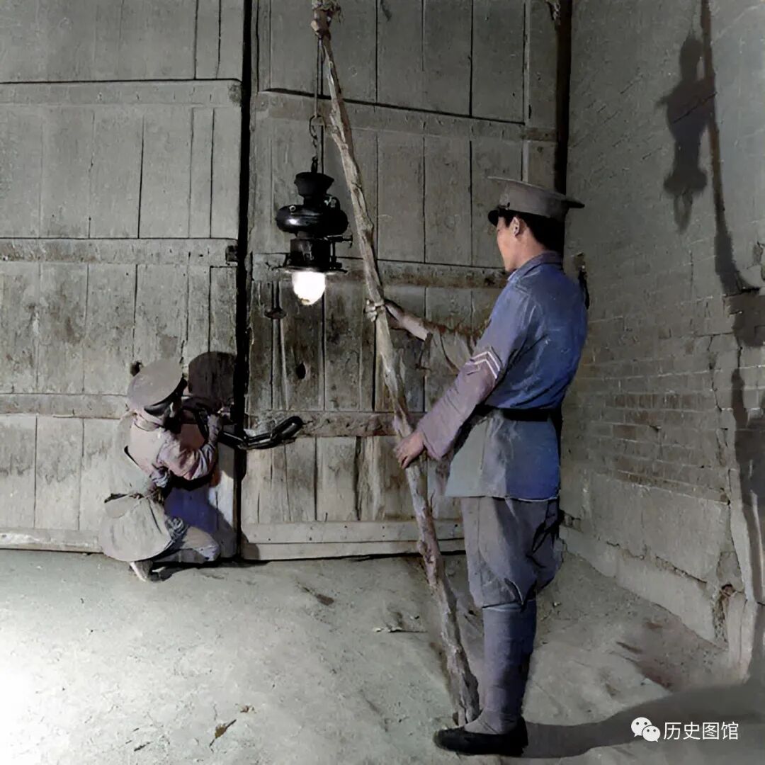 这张照片拍摄于西安临潼。夜深人静,城门下有两名守夜的门卫士兵。一名卫兵用木杆挑着汽灯照明,另一名卫兵蹲在地上,将城门锁好。可见,当时的临潼安保方便做得还是很严格和到位的。