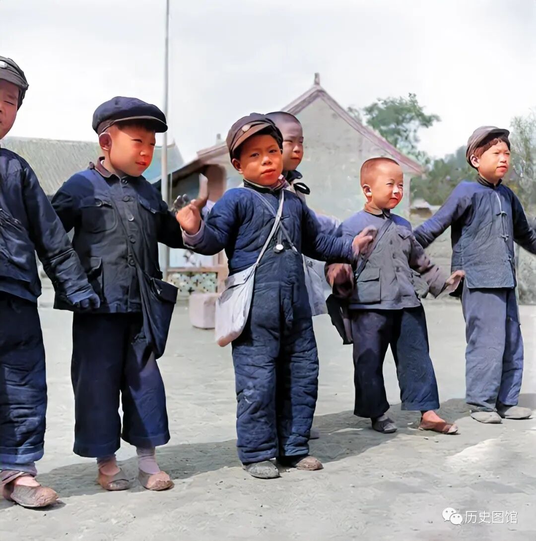 30年代末,在西安临潼一所小学里,几名小学生正在做游戏。他们身上背着小书包,手拉着手,脸上露出天真无邪的微笑。