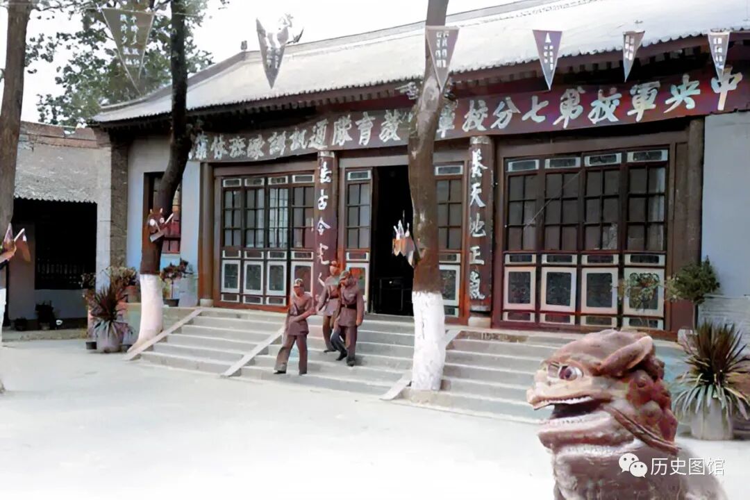 这是位于王曲镇的黄埔军校西安分校,由城隍庙改造成的校本部。照片中,几名军官正从教室里走出来,房檐下挂着条幅。