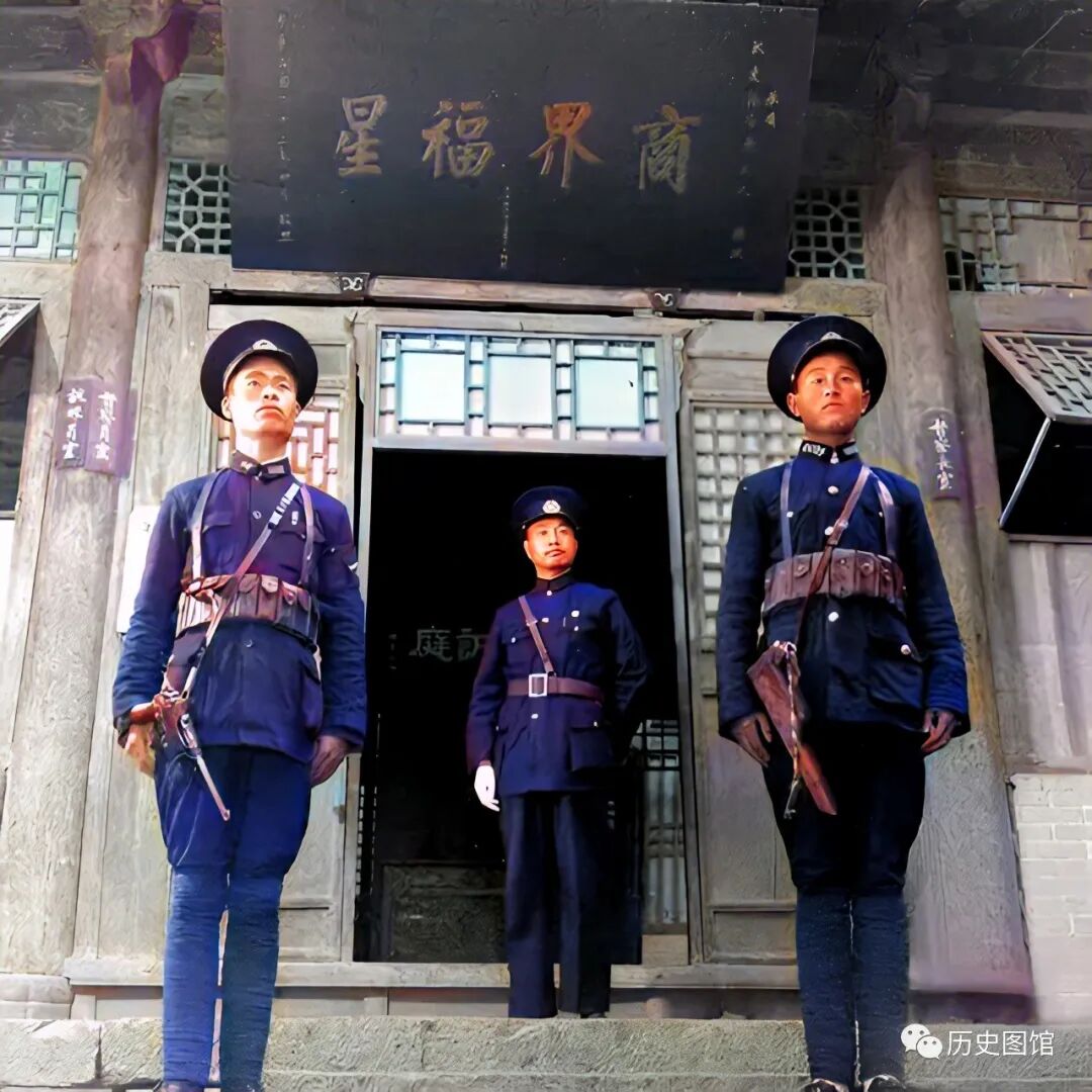 门口台阶上站立的是警察局长,面容威仪。两名警察全副武装,正在警局门口执勤站岗。