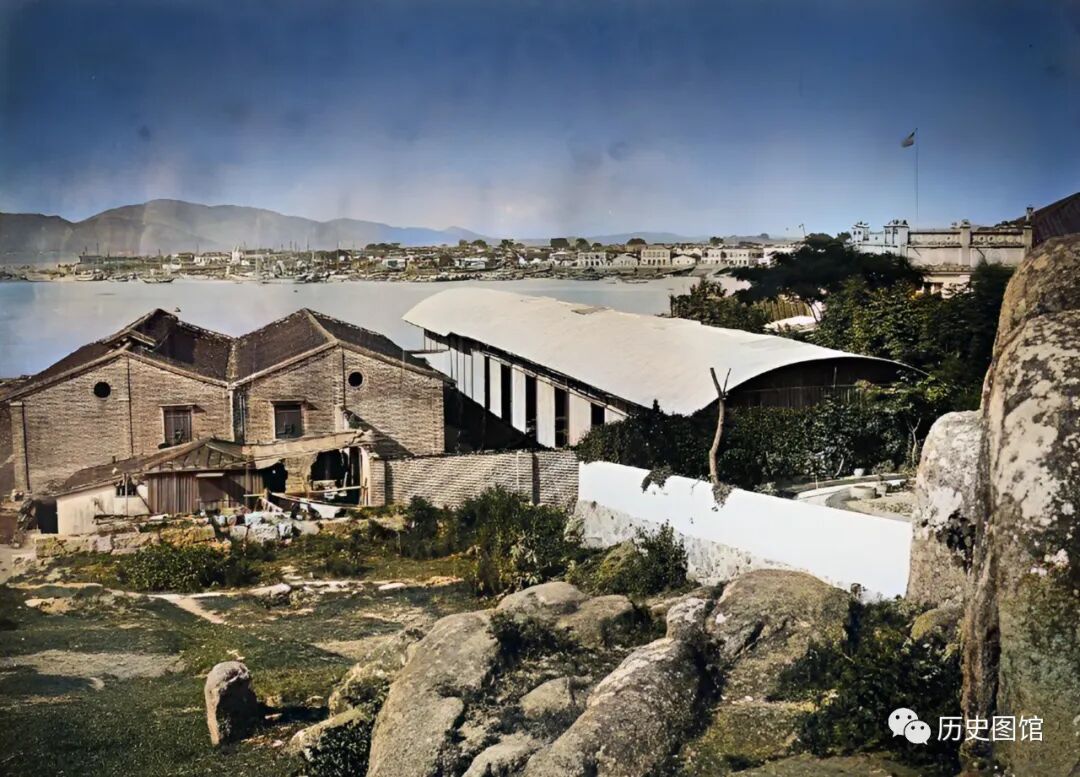 照片中,能看到有车间、大棚和工人住宿的房子。远处,江边有很多民居。在一栋欧式建筑的房顶,旗杆上的旗帜迎风飘扬。