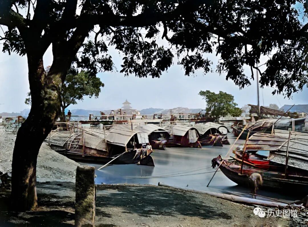 漳州新桥旁边,停泊着很多小船,这些船上都覆盖着棚子。这种船在南方非常普遍。船工们以船为生,以船为家。当时很多船上人家,吃住都在船上。