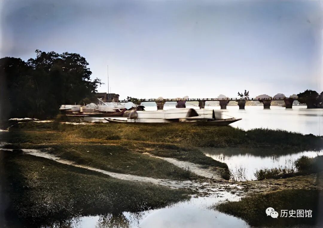 这是1903年的漳州新桥。大桥横跨江面之上,桥上人来人往。岸边一棵大树,一名男子站在水中。远处,还能看到巍峨高耸的八卦楼的身影。