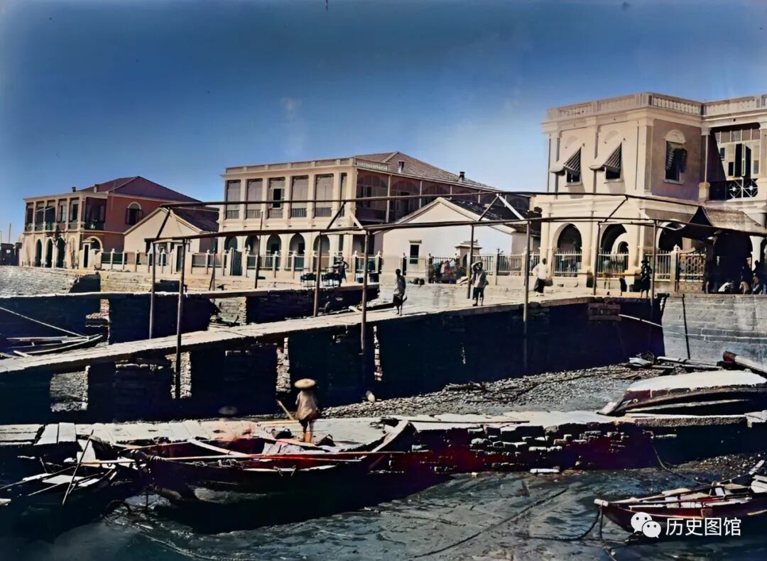 这是位于江边的一个码头,岸上的建筑大多为欧式,还修建有围墙。从岸上向河道中间,修建有栈道,方便行人上下船只。