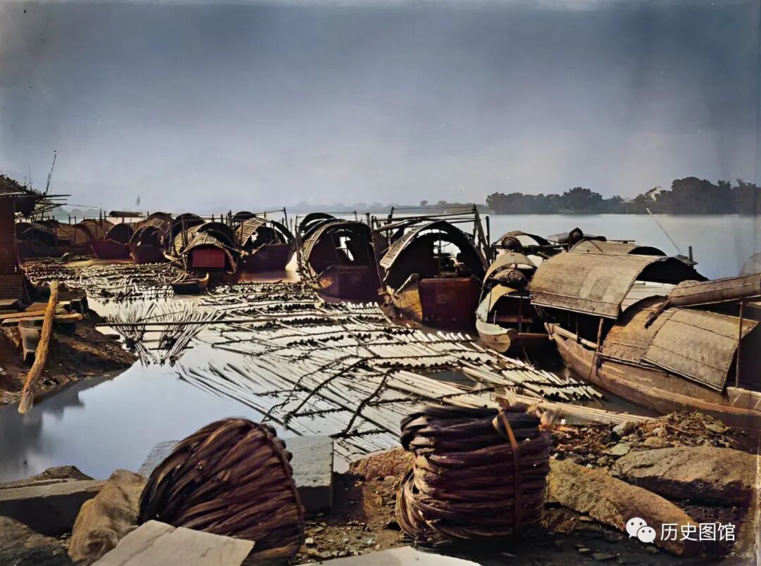 为了方便乘客上下船只,水中铺设了很多竹排,人可以走在上面登船。也能方便工人们从船上卸载货。江边堆放着很多等待装船的货物。