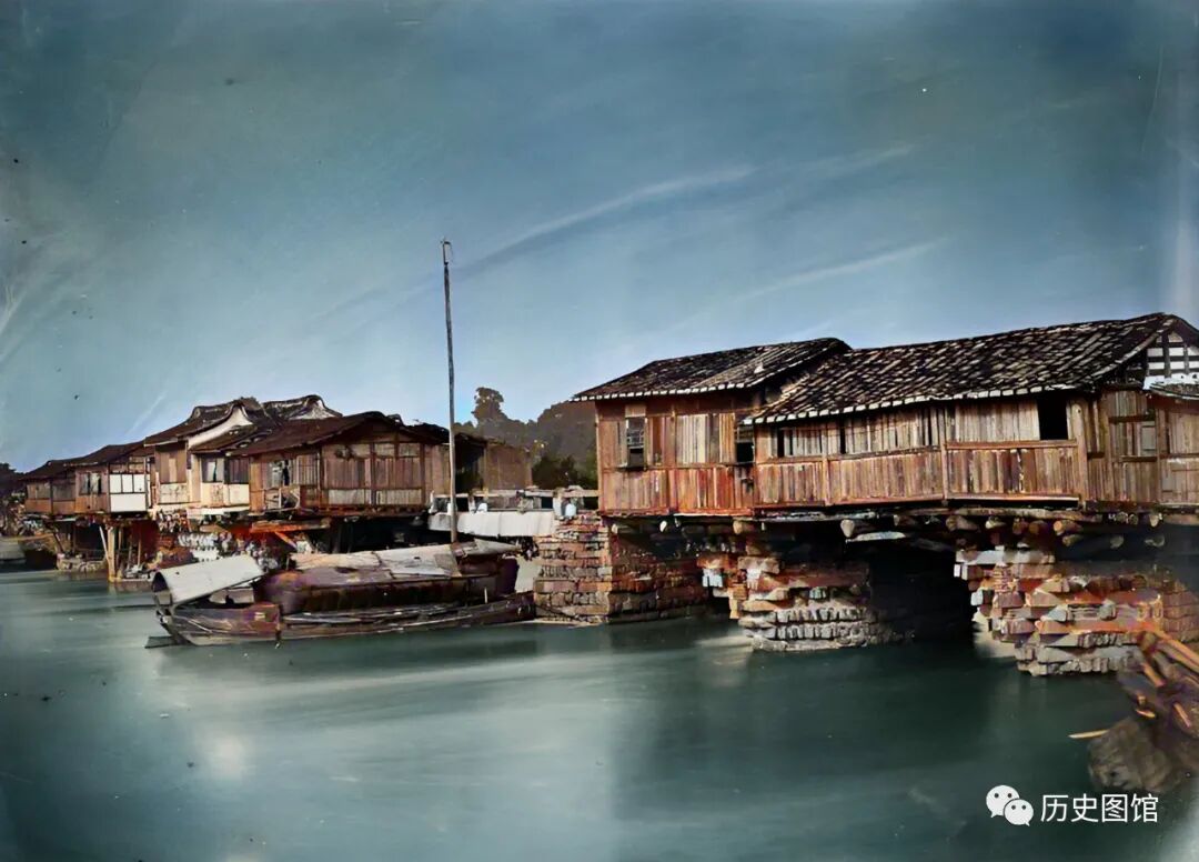 这是1903年的江东桥景象。江东桥,原名虎渡桥、通济桥,该桥始建于南宋嘉定七年(1214年),为梁式石桥,石板铺面。当时的江东桥很壮观。《龙溪县志》中描述江东桥:"广二十尺,长二千尺,桥孔十有五道"。