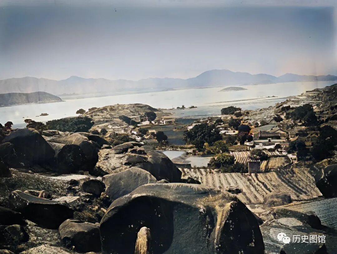 站在山上,极目远眺。远处青山在薄雾中时隐时现,海面上烟波浩渺,一眼望不到尽头。在近处的岸边,还能看到一块块农田,以及一些村落。