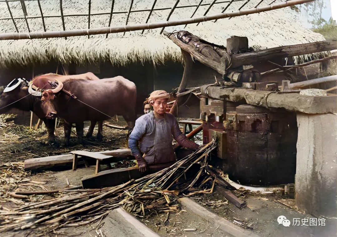 制糖手工作坊里,一名男子正在将甘蔗放进压榨机里,挤压出里面的汁液,熬制成糖。