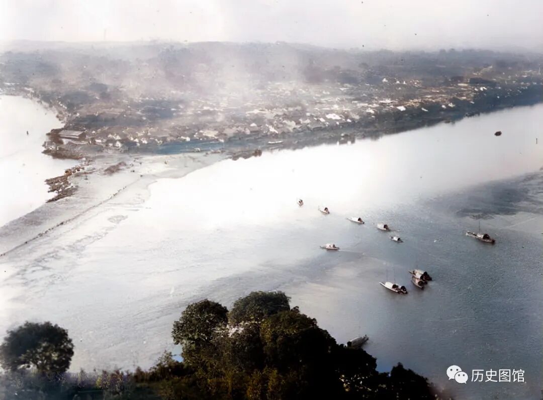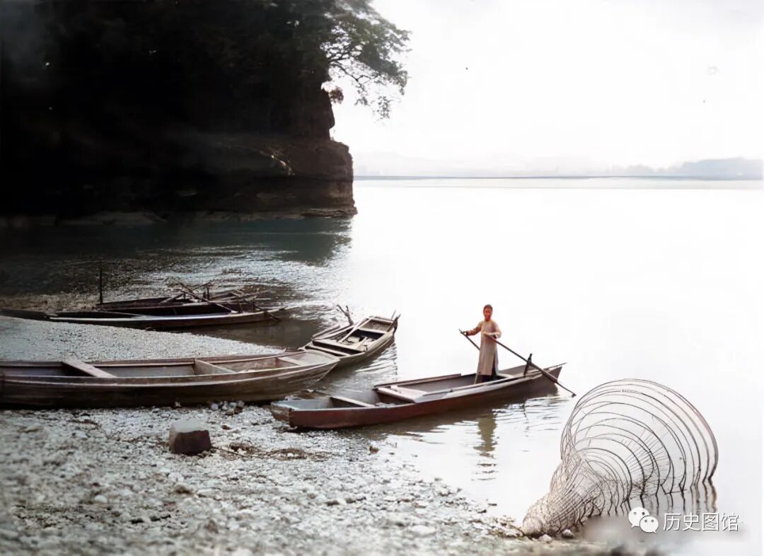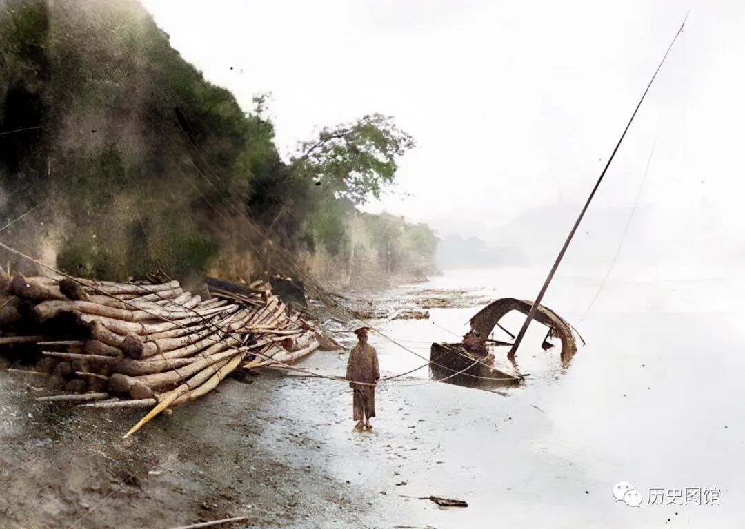 民国时期,军阀割据混战。居住在江边的渔民,为避免自己赖以生存的船只,被军阀征用拿去搭建浮桥,他们主动凿沉了自家的木船。照片中,一名军人站在被凿沉的小船前。
