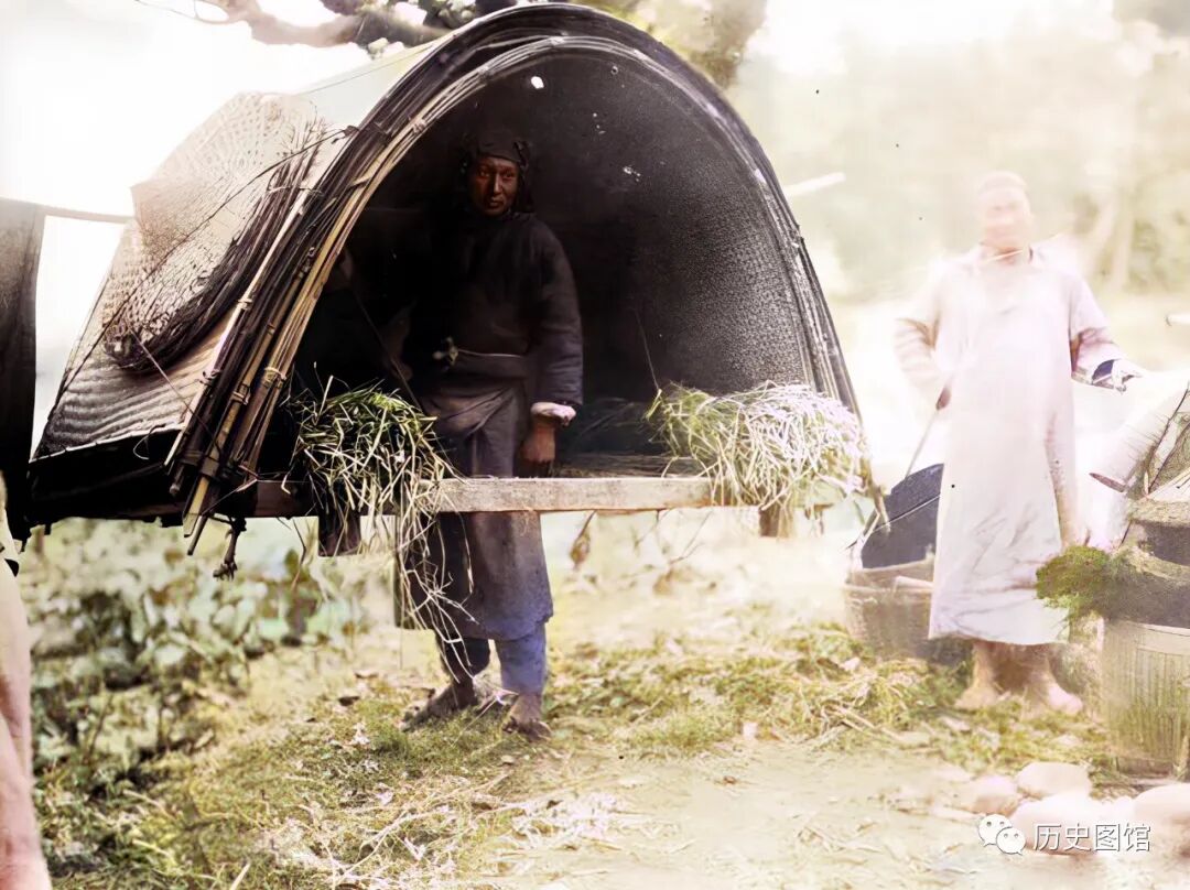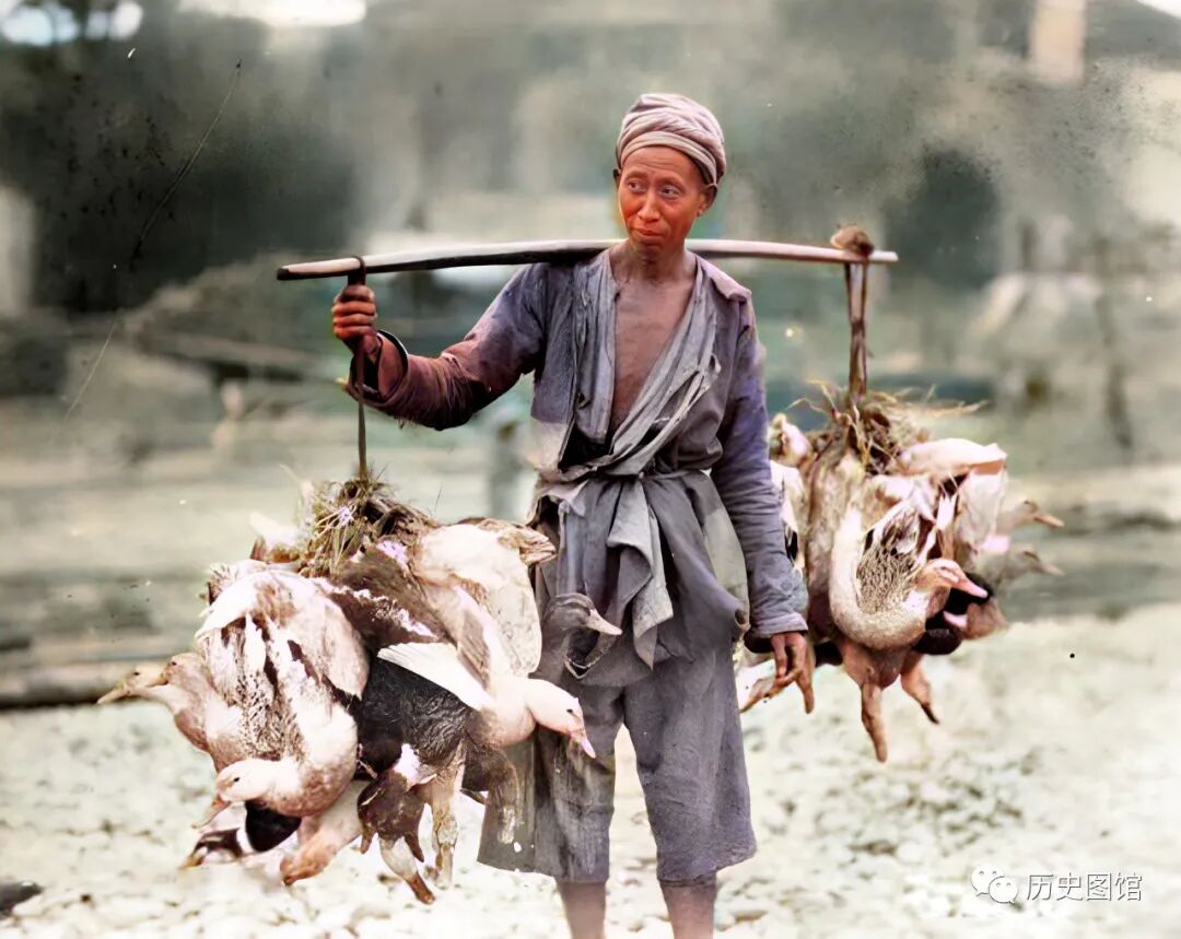 乐山当地一名养鸭人,正挑着的自己的住宅“鸭棚子”,前往下一处水域。这种棚子顶部弧形,下面有木框支撑,放鸭子的人可以躺在里面休息。移动起来也很方便,挑起来就走。