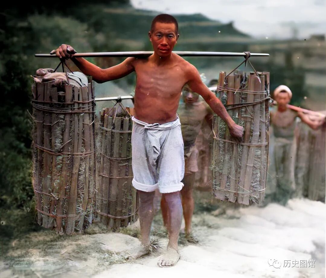 照片中,几名身强力壮的挑夫,正肩挑烟叶运送到山外。虽然这是一个体力活,但也能养家糊口。