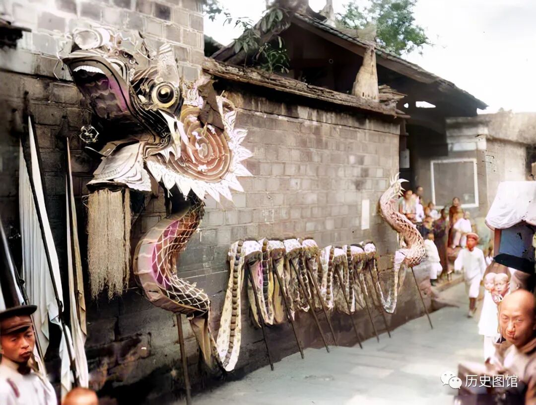 在乐山城内的一条小巷子里,正在举行一场活动,路边挤满了观众。舞龙队员将龙靠在院墙上休息,一名军人在现场维持秩序。可见,当时乐山人的文化生活还是很丰富的。