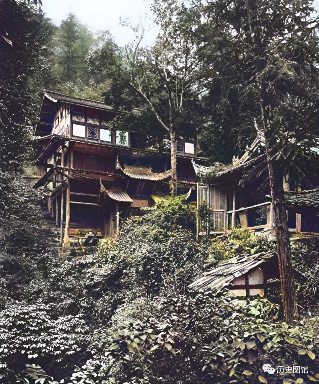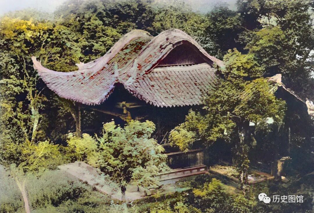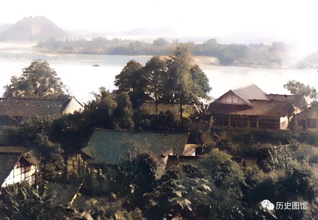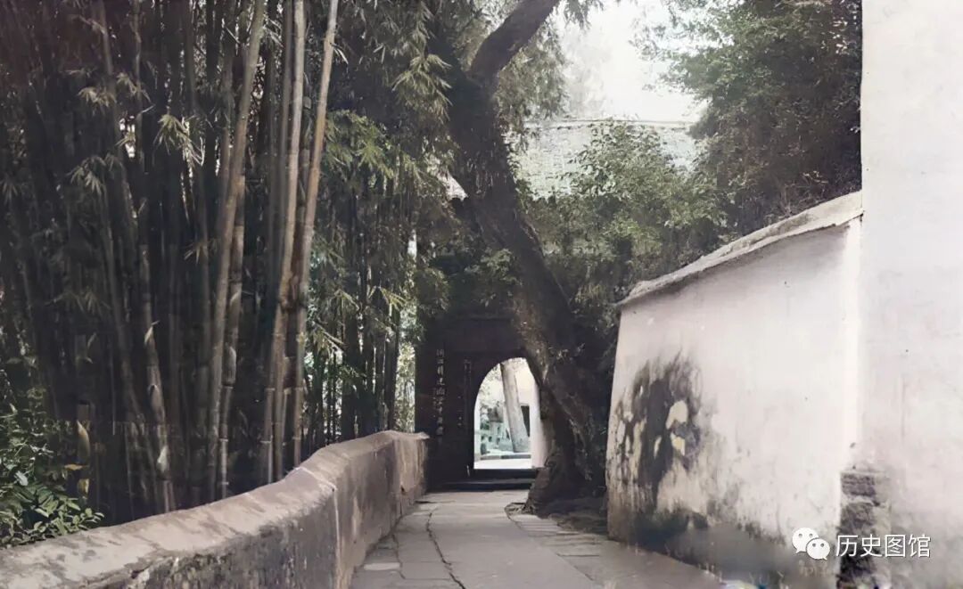 这是民国时期位于乐山市东岸乌尤山上的乌尤寺,该寺原名正觉寺,始建于唐朝。一条小路直通庙门。竹林深深,环境幽静,不失为一方净土。