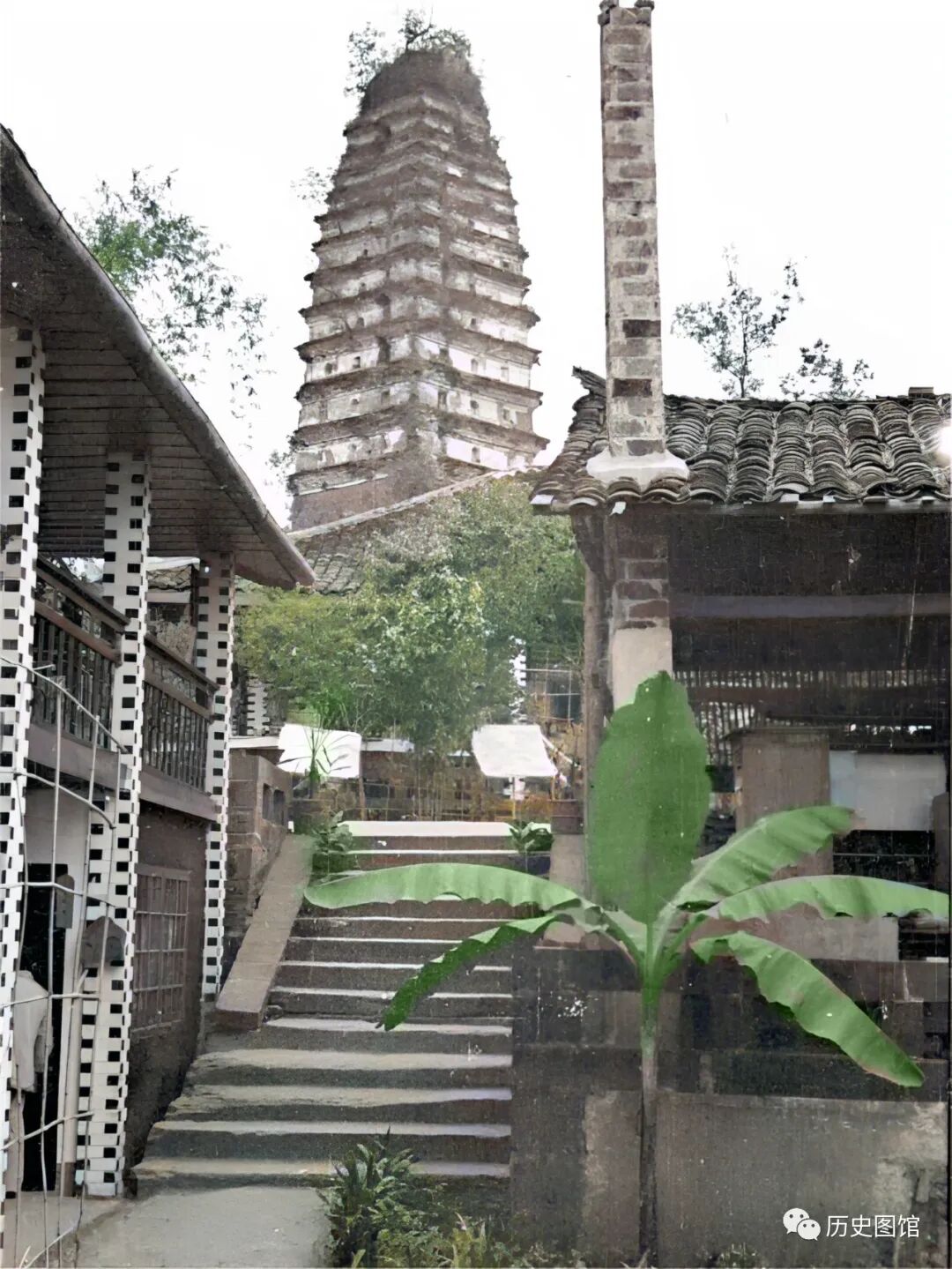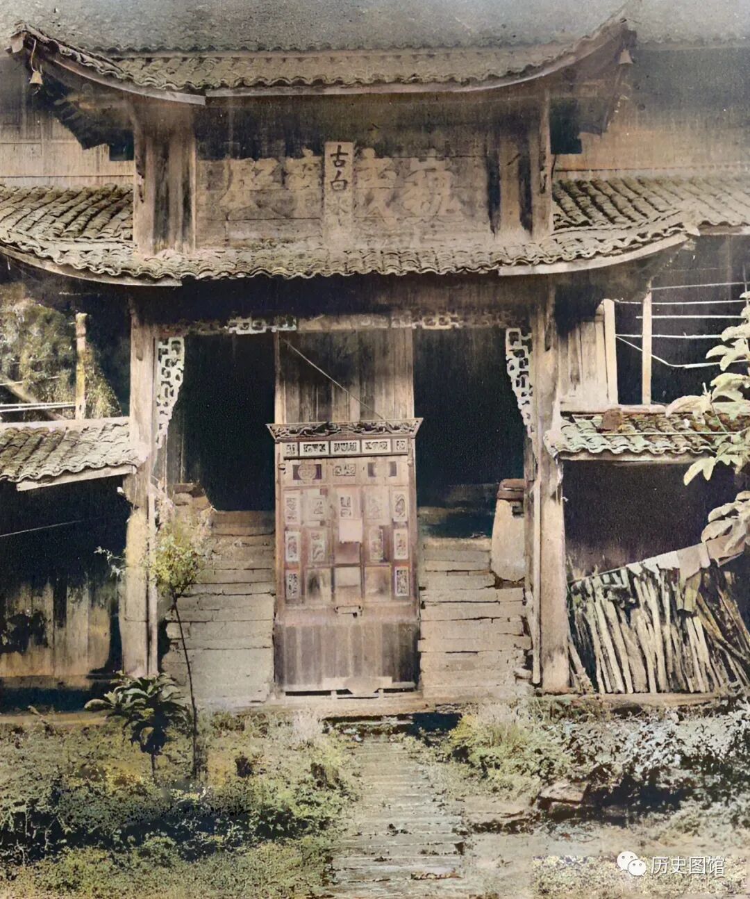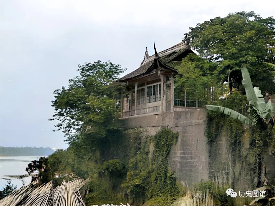 这是民国时期位于乐山市东岸乌尤山上的乌尤寺,该寺原名正觉寺,始建于唐朝。一条小路直通庙门。竹林深深,环境幽静,不失为一方净土。