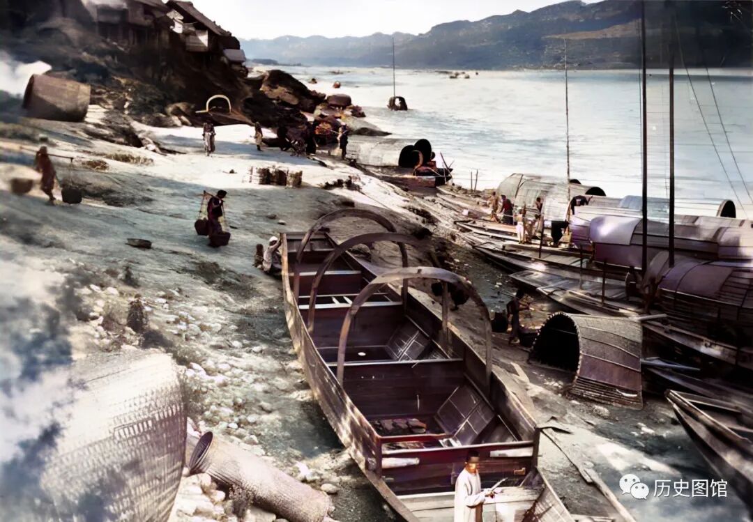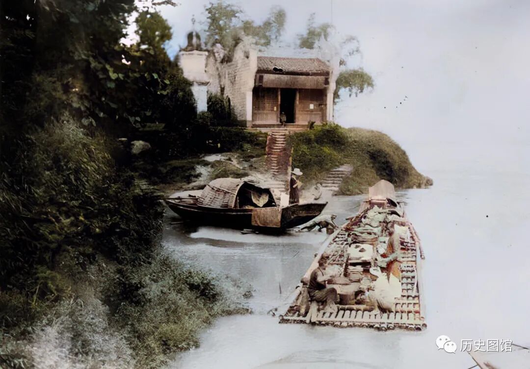 岷江边上,一座高台之上,矗立着一座不知名的庙宇。高台之下的江水中,有两艘小船停靠在岸边,两艘船正在装卸货物。