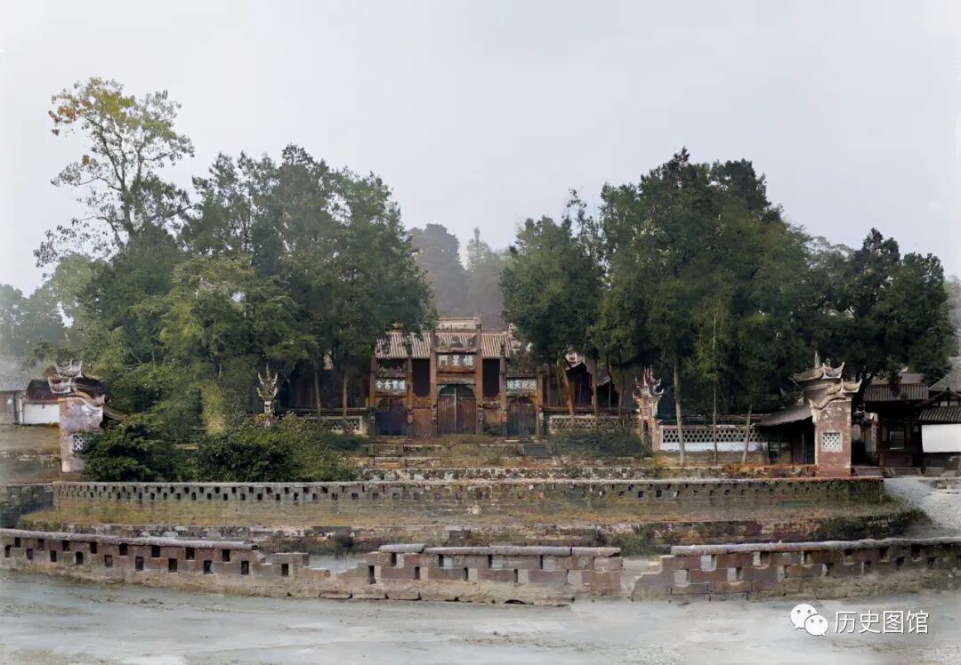 民国时期的乐山文庙。建筑古色古香,掩映在绿树丛中。石牌楼上“棂星门”三个字很是醒目。