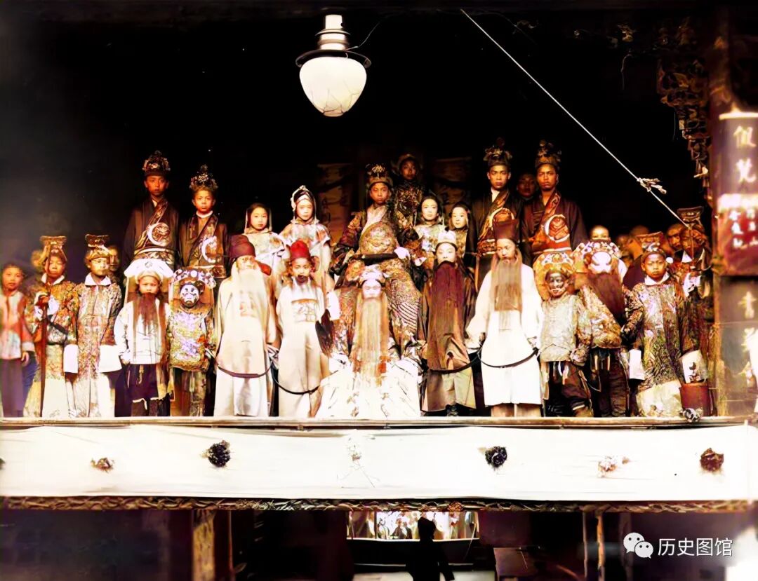 民国时期,乐山当地一个戏班子唱完戏后,全体演员来到舞台上答谢观众。
