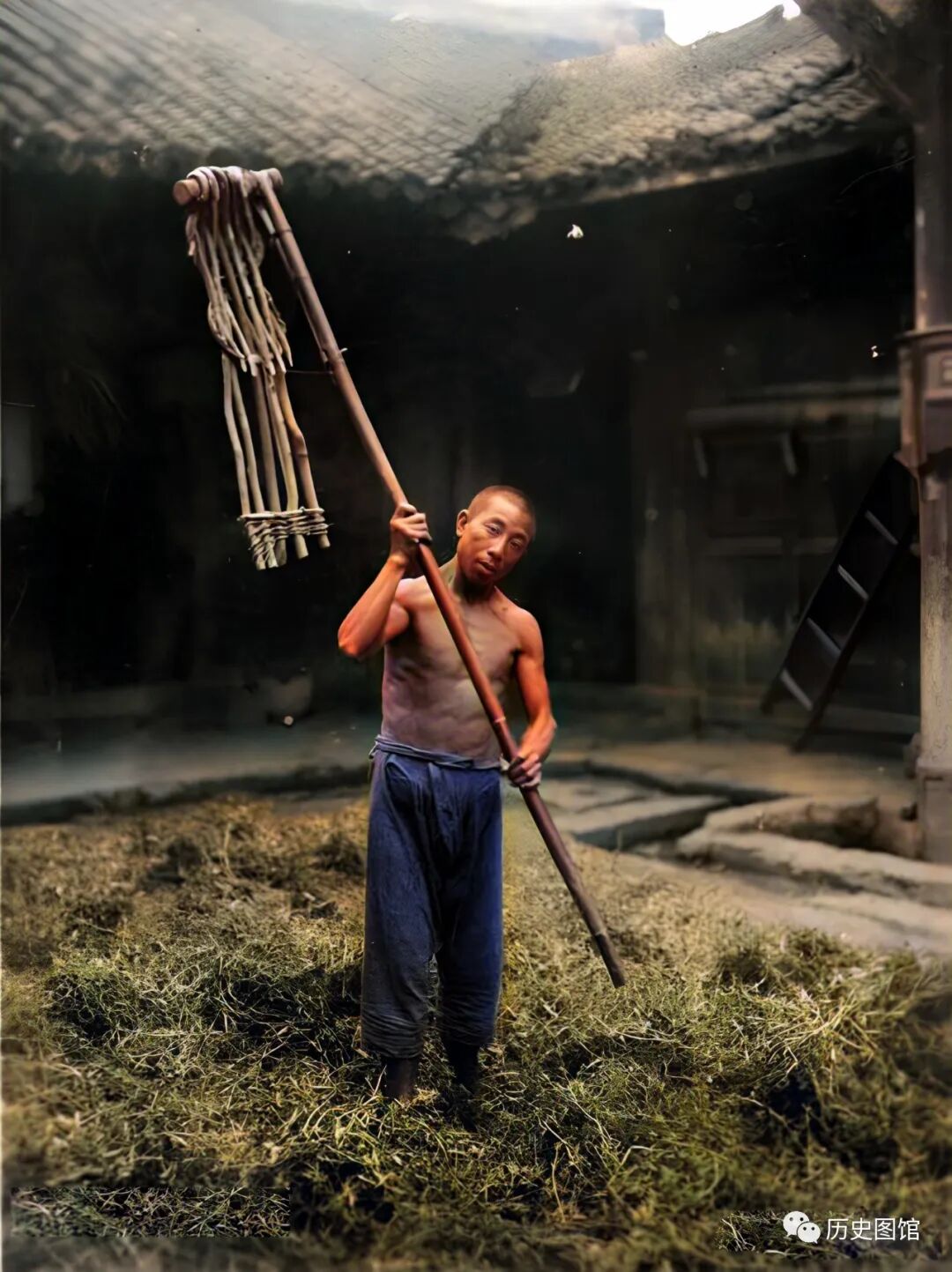 这种农具你见过吗?它叫连枷。照片中这名光着上身的男子,正手持连枷,不断摔打地上的黄豆秧。
