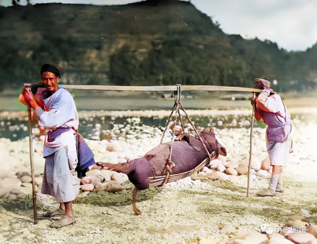 两名乐山当地人,抬着一头猪到集市上卖,每人手里还拄着一根木棍,走累了可以把抬杠放在上面休息一下。这里位于山区,车辆交通不便,人们出行主要靠步行。